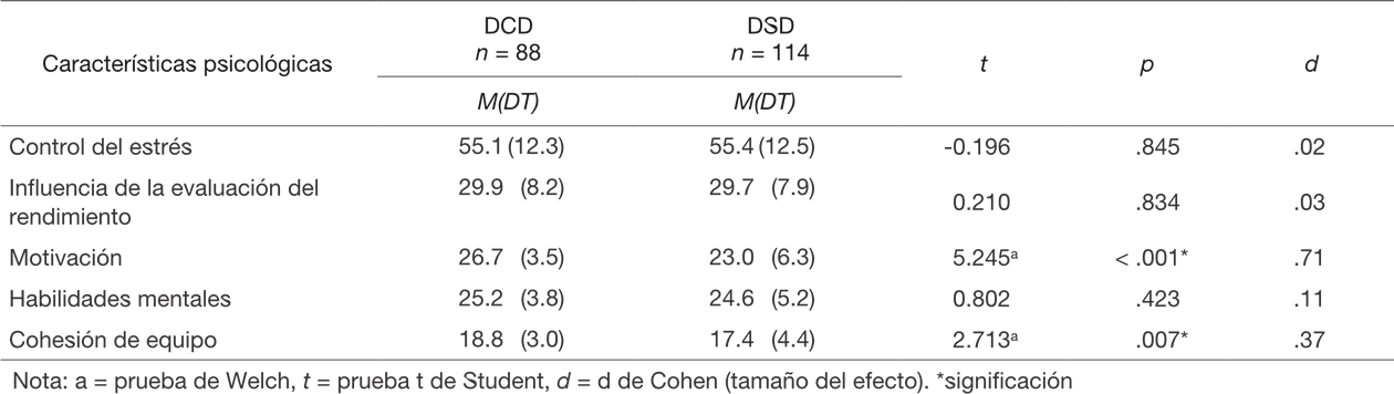 La comparación de las características psicológicas entre DCD y DSD (véase la Tabla 3) mostró diferencias en Motivación, t(185) = 5.24 p < .001, d = 71., IC del 95 % [0.43, 1.00]), ya que los DCD estaban significativamente más motivados. Además, la Cohesión de Equipo tuvo medias significativamente más altas para los DCD, t(185) = 2.71 p = .007, d = 69., IC del 95 % [0.09, 0.65]).