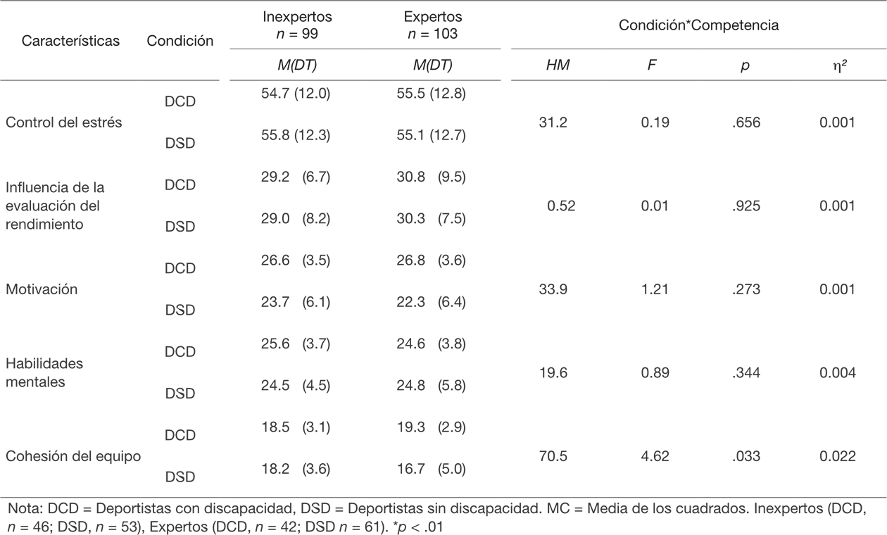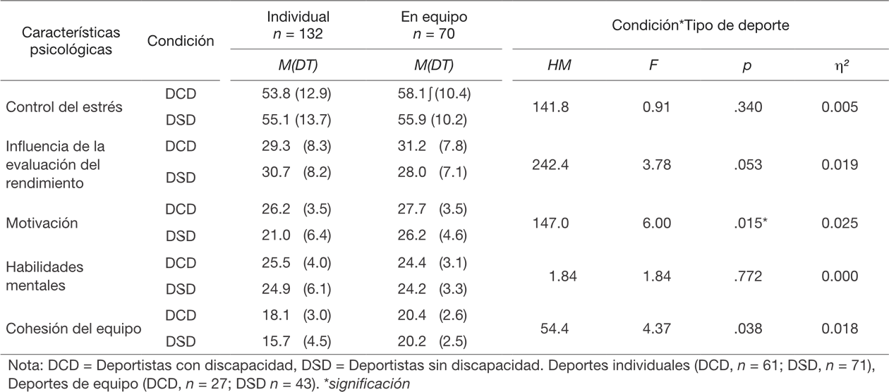 La interacción entre Condición*Tipo de deporte (véase la Tabla 5) mostró un efecto sobre la Motivación, F(1,198) = 6.00, p = .015, η2 = 0.025, así como en Cohesión de Equipo F(1,198) = 4.37, p = .038, η2 = 0.018. Las variables de Control del Estrés, Influencia de la Evaluación del Rendimiento y Habilidad Mental no mostraron efectos principales ni de interacción.