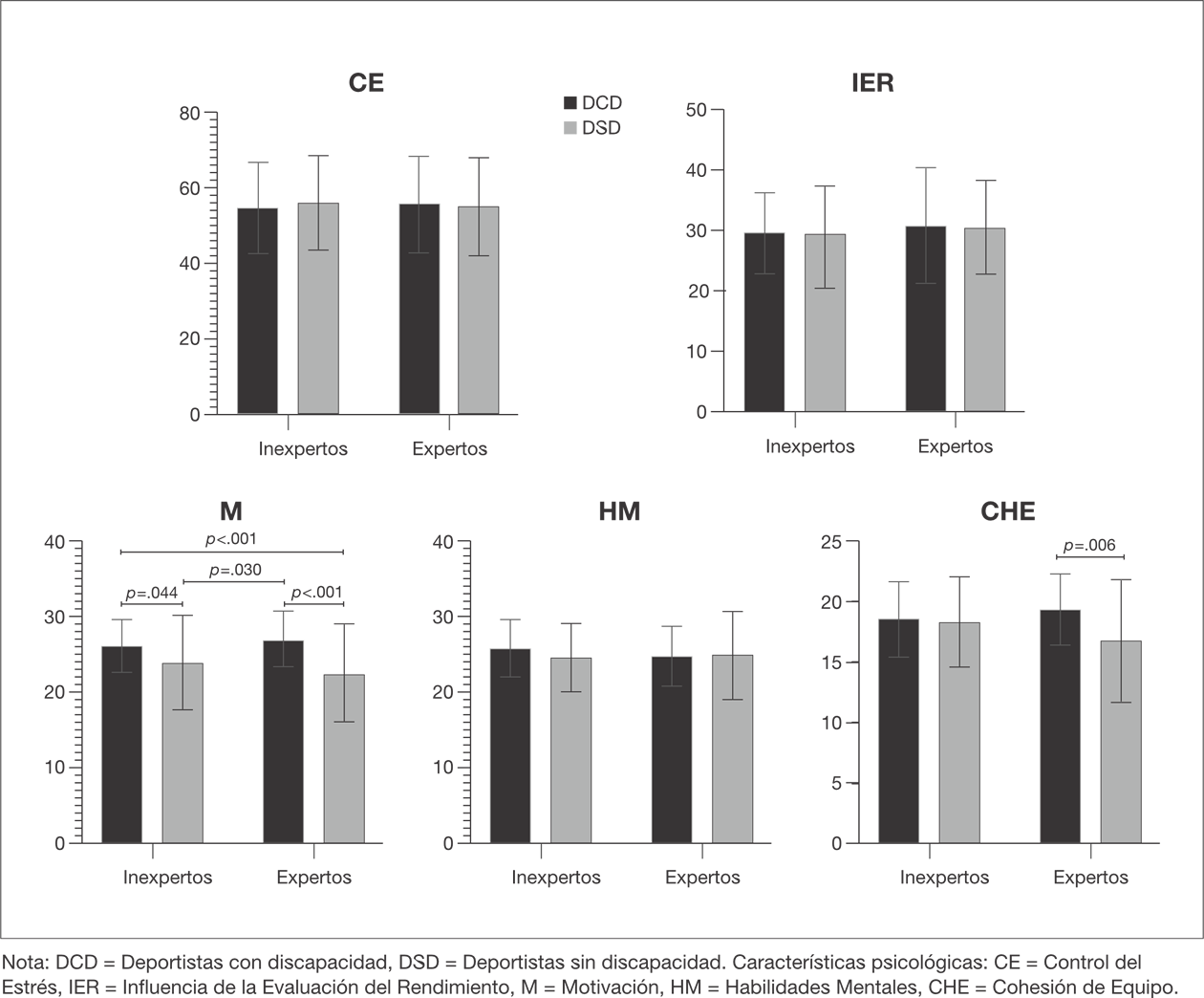 El objetivo de este estudio era doble: en primer lugar, comparar las características psicológicas (control del estrés, influencia en el rendimiento, motivación, habilidad mental y cohesión de equipo) entre DCD y DSD; y en segundo lugar, analizar las posibles diferencias en relación con la competencia (inexpertos frente a expertos) y el tipo de deporte (individual frente a deportes en equipo).