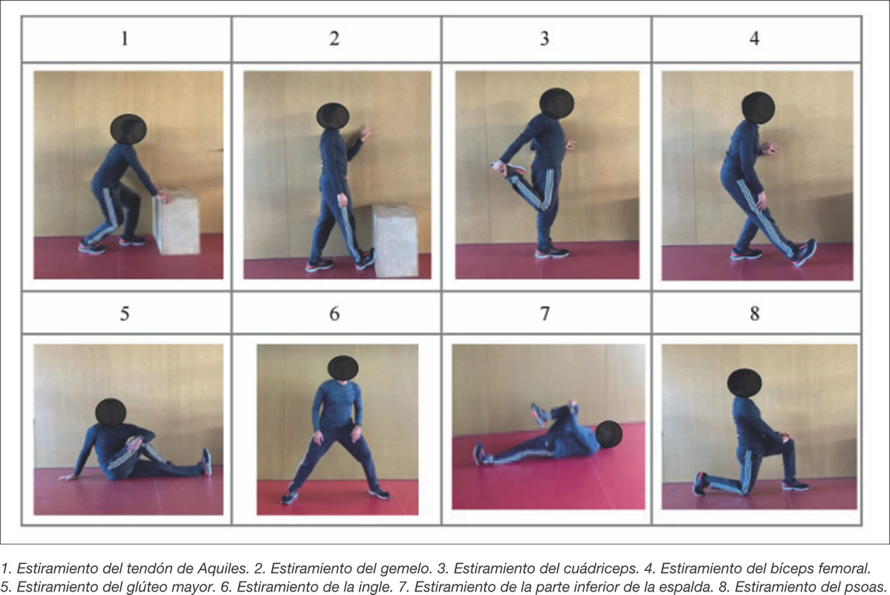 Todas las sesiones de intervención (CON, STA y DYN) estaban compuestas por una activación realizada caminando en el sentido de las agujas del reloj en torno a la pista de voleibol en el interior del gimnasio (18 x 9 metros) durante 3 minutos al 50 % del esfuerzo máximo percibido (Blazevich et al., 2018). A continuación, en la condición CON se mantuvieron 10 minutos en sedestación sobre un banco sueco con los 2 pies en contacto con el suelo y los omóplatos con la pared. En la sesión de la condición STA, se hicieron 8 estiramientos musculares estáticos para los miembros inferiores como se muestra en la figura 1 (Taylor et al., 2009). Estas posiciones se mantuvieron durante 30 s de elongación efectiva en cada punto y 1 minuto en ambas extremidades (8 minutos de tiempo de estiramiento total) y, para cambiar a la siguiente, se utilizaron 20 s de transición (un total de 10:20 minutos de tiempo de elongación más transición) (Taylor et al., 2009). Sin embargo, en la condición DYN se hicieron las 8 posiciones mostradas en la figura 1, en secuencias de elongación efectiva de 2 s con la misma sensación de tirantez que en la condición STA y 1 s de cese del estiramiento. Para conseguir el mismo tiempo efectivo de elongación en cada posición (30 s), extremidades (1 minuto) y tiempo total (8 minutos) que en la sesión STA. Paralelamente también se utilizaron 20 s de transición para cambiar a la posición siguiente, con 14:20 minutos de elongación más transición (Lin et al., 2020). El tiempo de inicio, fin y transición de los estiramientos se controló con la aplicación iCountTimer (RhythmicWorks Software LLP) para el teléfono inteligente Iphone 6 IOS 16.0 (Apple, Inc., Cupertino, California, Estados Unidos). En este sentido, para intensificar el control acústico del tiempo de intervención, se conectó el teléfono inteligente por señal Bluetooth (Bluetooth Special Interest Group, Inc.) a una radiofrecuencia de 2.4 GHz a un altavoz externo sin hilos Sony SRS-XE300 (Sony Group Corporation, Tokio, Japón). Seguidamente (< 1 minuto) a los procedimientos de intervención descritos en las sesiones CON, STA y DYN, completaron 5 CMJ en la plataforma de contacto (Chronojump, Bosco System, Barcelona, España) con una resolución temporal de 1 milisegundo (ms) a una velocidad de obtención de datos de 1,000 Hz para registrar las variables dependientes (ver introducción). Para el tratamiento de los datos de los 5 CMJ, se seleccionaron 4 saltos, descartando el primero o de inicio (Serrano-Ramon et al., 2023).