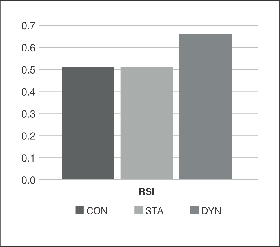 Los resultados mostraron incrementos estadísticamente significativos en el RSI (ver figura 2) con un tamaño del efecto mediano F(1,52) = 20.21, . < .001, η.² = .06, β -1 = 1. En la condición de DYN (. = 0.66, DE = 0.52) las puntuaciones fueron superiores que CON (. = 0.51, DE = 0.26, . < .001, [IC 95 % 0.07, 0.23]) y STA (. = 0.51, DE = 0.27, . < .001, [IC 95 % 0.08, 0.23]). Por otra parte, el CT (ver figura 3) mostró un incremento significativo en la condición STA (. = 0.45, DE = 0.19) con respecto a CON (. = 0.41, DE = 0.15, . < .01, [IC 95 % 0.01, 0.07]) y DYN (. = 0.39, DE = 0.16, . < .001, [IC 95 % 0.02, 0.08]) con un tamaño del efecto pequeño F(2,0) = 8.58, . < .001, η.² = .02, β -1 = .97. En cambio, el HGT (ver figura 4) mostró incrementos significativos con un tamaño del efecto mediano F(1,97) = 24.84, . < .001, η.² = .07, β -1 = 1, en la condición DYN (. = 22.29, DE = 7.71) con respecto a STA (. = 19.82, DE = 6.34, . < .001, [IC 95 % 1.21, 3.72]) y CON (. = 18.67, DE = 6.52, . < .001, [IC 95 % 2.28, 4.96]).
