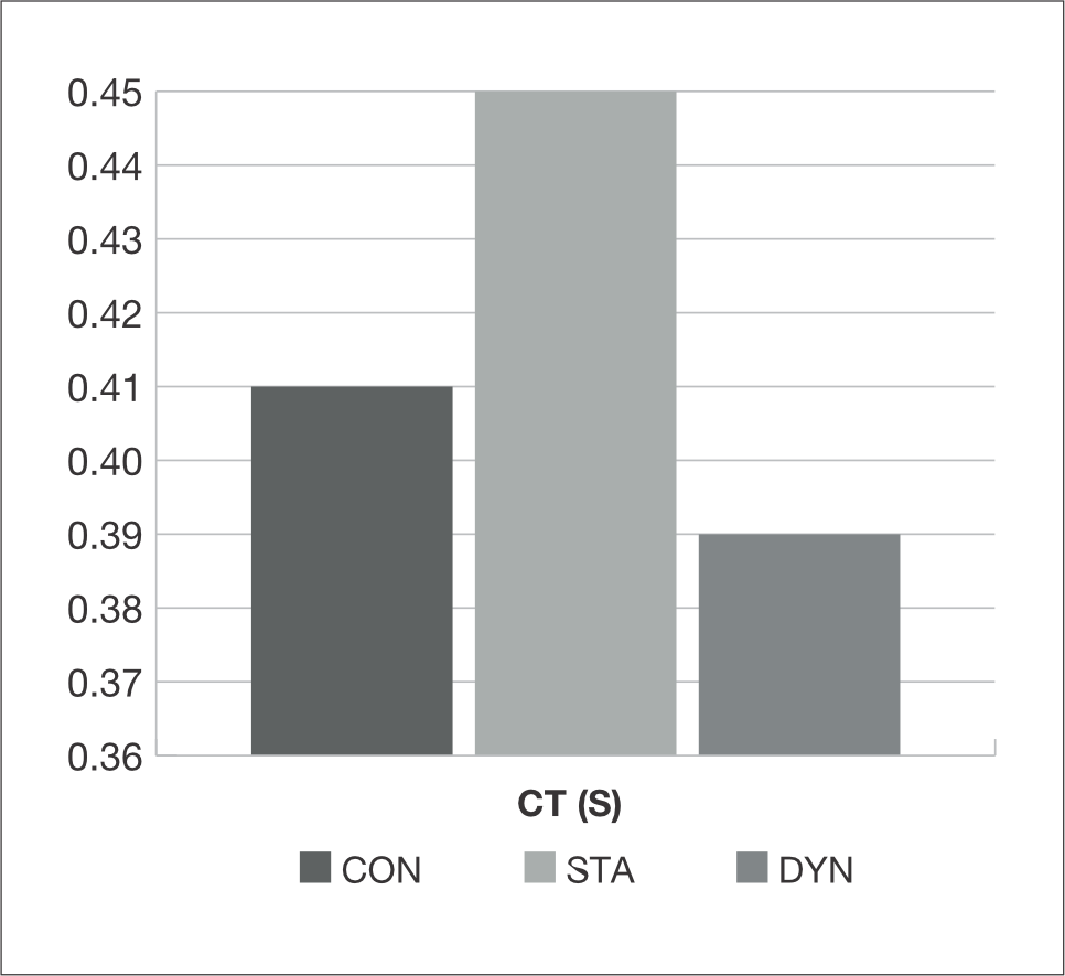 Con respecto a la variable CT, en este estudio se registró un incremento significativo de la condición STA en comparación con CON y DYN. Estos resultados se alejan de los obtenidos por Werstein y Lund (2012), en los que no obtuvieron diferencias en ninguna condición, posiblemente justificado por la relación con las anteriores diferencias metodológicas aportadas en la variable RSI. Esta afirmación podría justificarse por el hecho de que el CT es un componente del RSI y la influencia negativa de la condición STA con el rendimiento del CMJ (Takeuchi et al., 2021; Warneke et al., 2022). Asimismo, Young y Behm (2003) apoyaron la fundamentación expuesta por Werstein y Lund (2012), no mostrando diferencias en el resultado de CT en ninguna condición, aunque tenían algunas distinciones como el salto en profundidad (30 cm), la activación realizada corriendo y no caminando y menos ejercicios de elongación muscular que en el presente trabajo (4 vs. 8). En línea con nuestro resultado, Lima et al. (2018) obtuvieron disminuciones significativas en el CT con la condición STA en comparación con CON (8.55 % vs. 10.97 %), utilizando el mismo tiempo de estiramiento estático (30 s), número de CMJ, pero con menos posiciones (6 vs. 8).