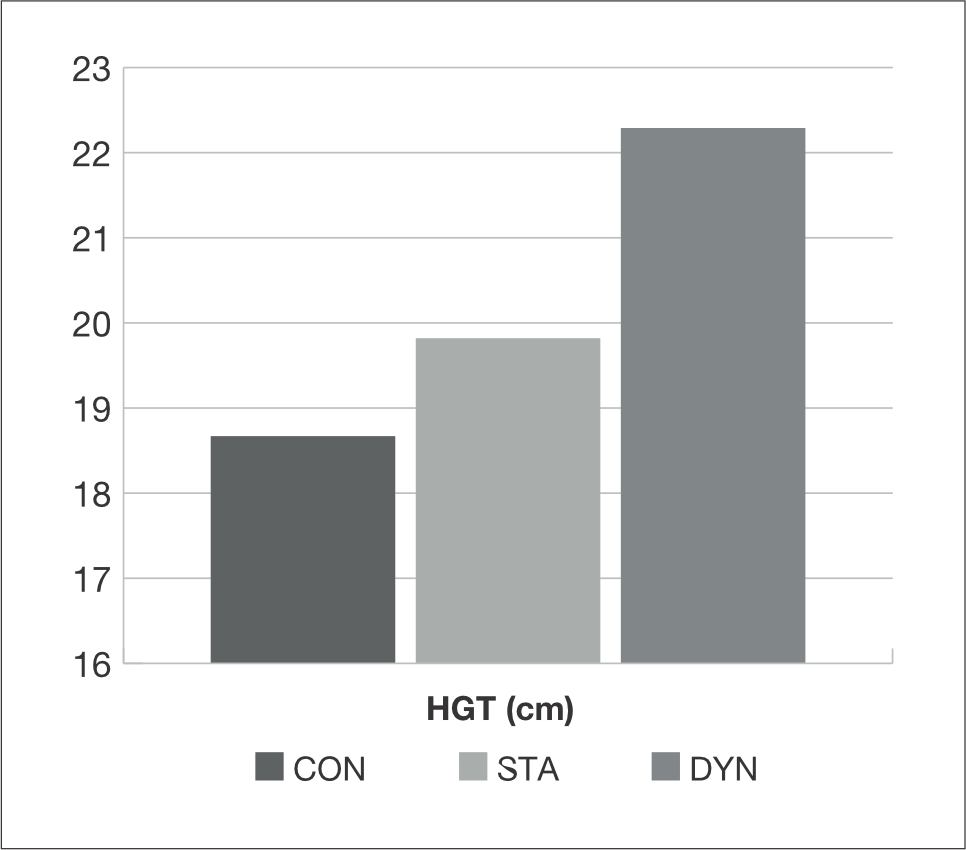 Otra variable relacionada con el CMJ y asociada a múltiples investigaciones que comparan las condiciones de CON, STA y DYN es el HGT. Nuestros resultados han mostrado incrementos significativos en DYN en comparación con el resto (CON y STA). En este sentido, el trabajo de Montalvo y Dorgo (2019) también encontró mejoras significativas con HGT en DYN vs. STA (8.24 %) inferiores a las nuestras (11.08 %). A pesar de algunas diferencias metodológicas, como un número reducido de CMJ (2 vs. 5), que podría provocar esta diferencia de resultados entre estudios (He et al., 2022). En relación con las diferencias entre CON y STA, nuestros resultados no coinciden con los mostrados por Pinto et al. (2014). En concreto, porque entre CON y STA con una elongación de 30 s no encontraron ninguna diferencia, ya que se estableció en la condición STA con un tiempo de estiramiento de 60 s, mostrando una reducción del –3.40 %. Todo eso a diferencia de nuestra investigación, que registró incrementos de 5.80 % en la condición STA vs. CON. La reducción de HGT entre STA 60 s vs. CON fue –3.40 %, teniendo en cuenta que en el estudio de Pinto et al. (2014) se hicieron menos CMJ en comparación con el nuestro (3 vs. 5); además, se recuperaron 10 s entre cada CMJ, se hicieron un número inferior de ejercicios (4 vs. 8) y un calentamiento previo en el CMJ diferente (5 minutos sentado vs. 5 minutos caminando). La realización de un número inferior de CMJ y pausas intercaladas podría ser uno de los condicionantes que provoca la diferencia de los resultados entre estudios (He et al., 2022), unido al procedimiento de activación estático que podría perjudicar el rendimiento posterior en el CMJ (Tsurubami et al., 2020), al no conseguir una temperatura óptima para la contracción muscular (Lopez-Samanes et al., 2021).