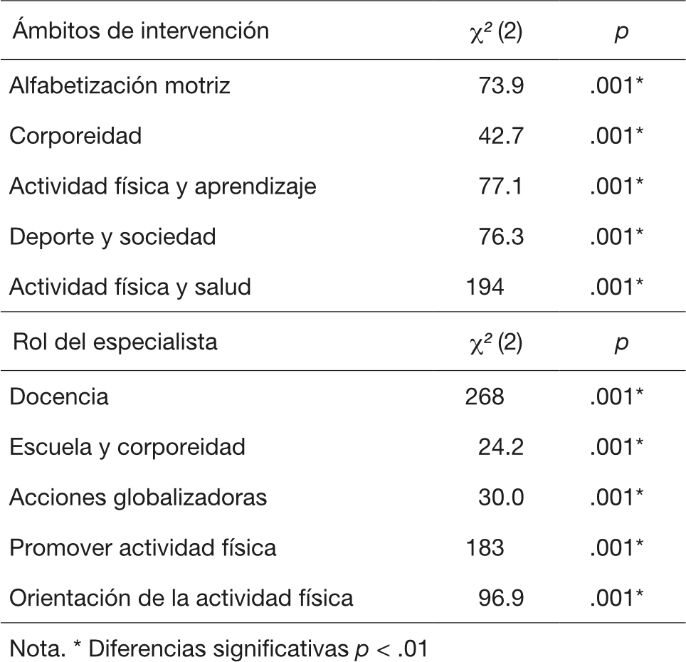 Al aplicar la pruebaχ² Chi-square_Goodness Of Fit Test tanto para la variable “ámbitos de intervención educativa” como para la variable “roles del especialista”, se encontraron diferencias estadísticamente significativas en las evaluaciones de todos los ítems (Tabla 1).