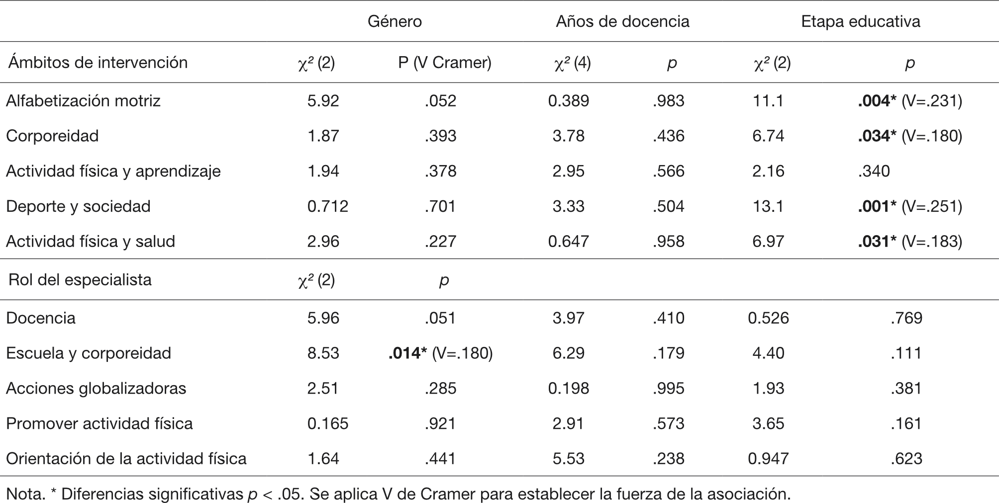 En líneas generales, el análisis bivariable mostró que no había significación estadística en relación con el género (exceptuando solo el ítem Escuela y corporeidad) ni tampoco respecto a los años de experiencia profesional. Los ítems de los ámbitos de intervención educativa sí que se mostraron sensibles a las etapas educativas de los especialistas.
