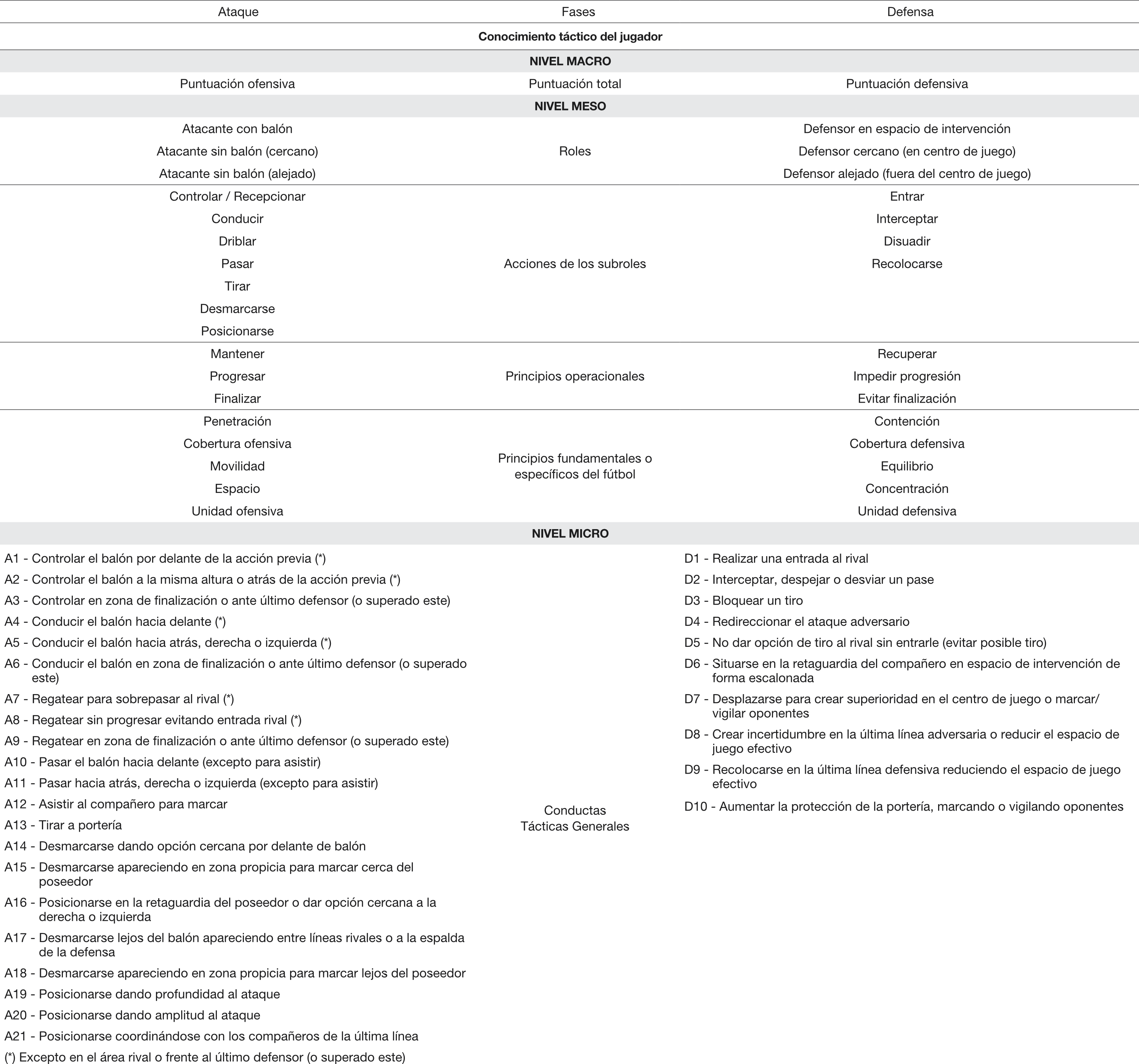 La prueba fue completada por los participantes en mayo, al final de la temporada 2021-2022. Después, usando una estrategia asociativa, se aplicó un diseño comparativo de enfoque retrospectivo (Ato et al., 2013), que determinó la posible influencia de la variable independiente sobre las variables dependientes. En este caso, la posición de juego actuó como variable independiente y las variables dependientes fueron las 67 puntuaciones basadas en el CTD de los participantes, de acuerdo con tres niveles de concreción, desde lo más general a lo más específico. Un primer nivel, o macro nivel, que permite analizar las puntuaciones totales del test (global, ofensiva y defensiva); un segundo nivel, o meso nivel, formado por los sistemas de categorías de los criterios (roles, acciones de los subroles, principios operacionales y principios fundamentales o específicos del fútbol) que componen el sistema de observación utilizado como marco de referencia; y un tercer nivel, o nivel micro, donde se encontrarían las puntuaciones más específicas basadas en las conductas tácticas generales (véase Tabla 1).