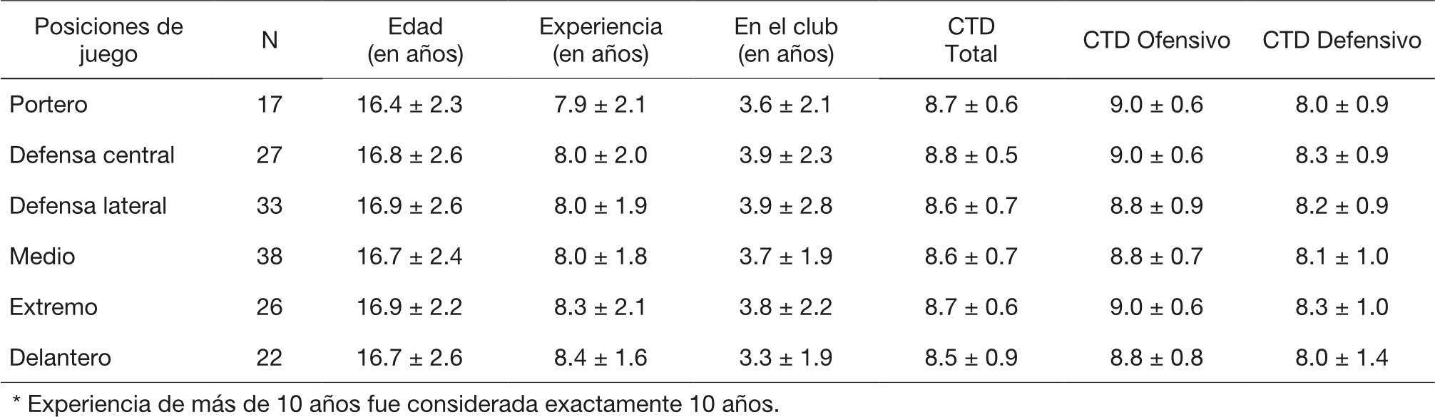 Las puntuaciones del test a nivel macro (en una escala de 0 a 10) no reflejaron diferencias significativas en ninguna de las tres variables estudiadas: puntuación global (. = .76, . = 0.53), puntuación ofensiva (. = .72, . = 0.58) y puntuación defensiva (. = .81, . = 0.46). La tabla 2 muestra el promedio y desviación de las puntuaciones obtenidas por posición de juego.