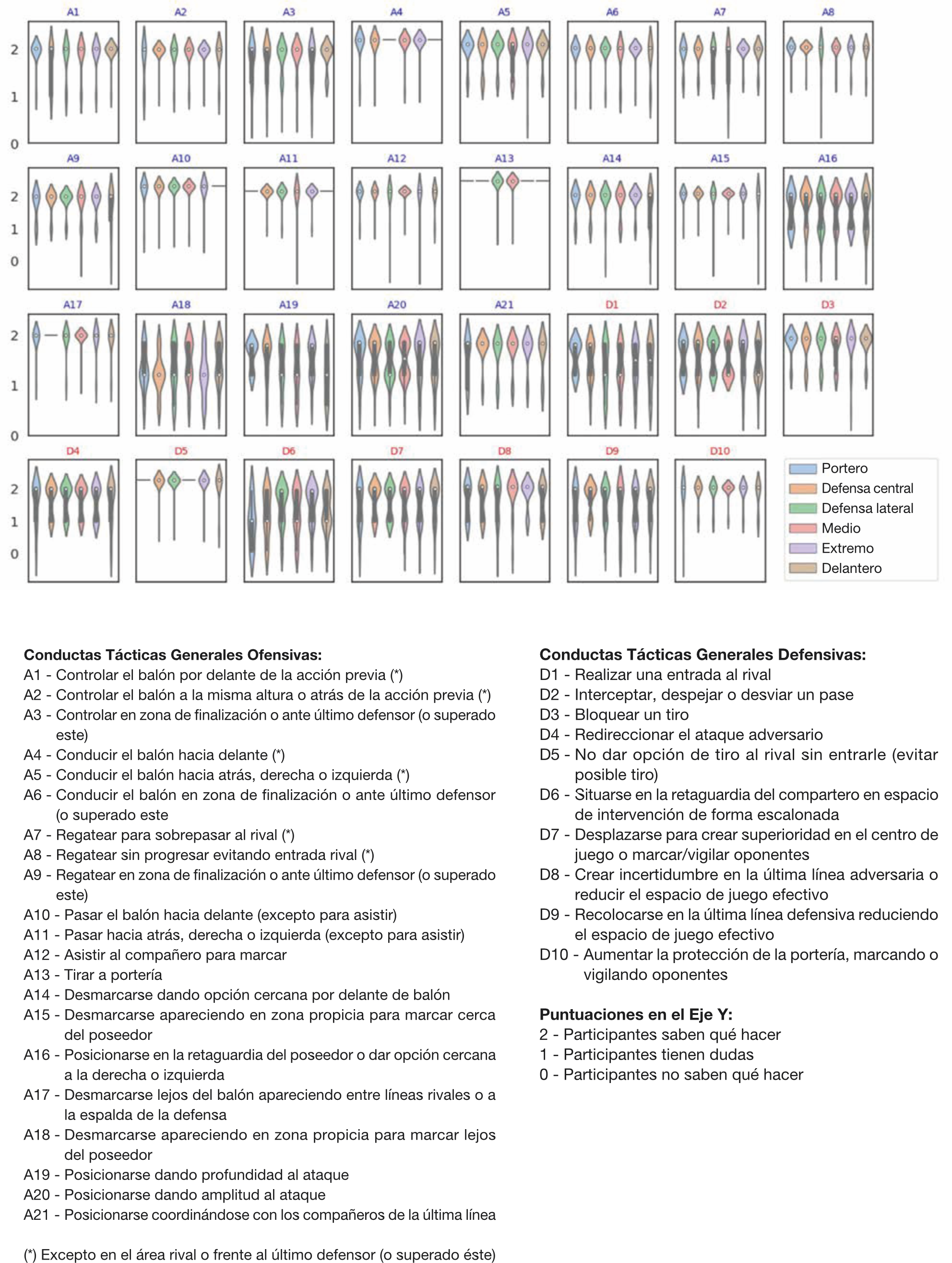 Finalmente, el nivel micro (en una escala de 0 a 2) representa el máximo nivel de detalle y está vinculado a las conductas tácticas generales del marco de estudio. En este caso, se encontraron diferencias significativas en las siguientes conductas: “regatear para sobrepasar al rival” (. = .01, . = 2.98) y “posicionarse dando profundidad al ataque” (. = .01, . = 3.17). Las comparaciones post hoc por pares para “regatear para sobrepasar al rival” mostraron diferencias no significativas (. = .02) de tamaño de efecto moderado (. = 0.84) entre extremos (1.9 ± 0.3) y medios (1.5 ± 0.6). Respecto a “posicionarse dando profundidad al ataque”, los porteros (1.7 ± 0.5) y los centrales (1.6 ± 0.7) obtuvieron las mejores puntuaciones, y los medios (1.1 ± 0.8) y delanteros (1.0 ± 0.8) las peores. Las comparaciones post hoc por pares evidenciaron diferencias no significativas entre los porteros y medios (. = .07), porteros y delanteros (. = .03) y centrales y delanteros (. = .08). Las diferencias fueron de tamaño de efecto moderado (. = 0.9, . = 1.04 y . = 0.8, respectivamente). Una visión general de todos los resultados obtenidos a nivel micro se muestra a través de gráficos de violín en la figura 2, lo cual evidencia la densidad de las puntuaciones en cada sección evaluable.