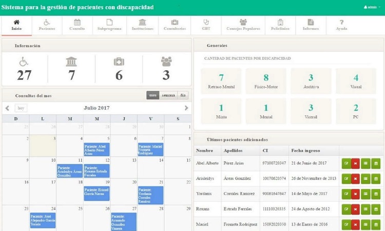 Una vez que el usuario se autentica de manera correcta accede a la página de inicio que se muestra en la Figura 1. En ella se encuentra el menú de opciones (parte superior) y una estadística de las cantidades totales de registros actualizados. Ahí se puede consultar el listado de los últimos pacientes adicionados y la programación de las consultas, estas últimas aparecen en un calendario que se muestra por mes, semana o día, lo que le facilita a los defectólogos y especialistas una mejor gestión de su agenda de trabajo.