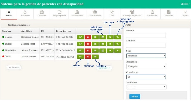 La Figura 2 muestra la página para actualizar la información de los pacientes, donde entre otras opciones se puede programar sus consultas. Los eliminados son señalados con un punto rojo y permanecen en el sistema, aunque no aumentan la cifra en los informes. Se puede filtrar la información, en esta figura se aplicó a los pacientes de sexo femenino que pertenecen a un determinado consultorio, esto permite acotar lo que se desea mostrar.