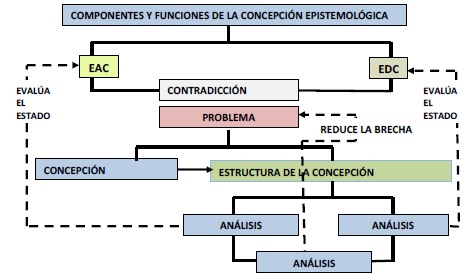 En la Figura 1 se parte de la contradicción entre el estado actual de la concepción epistemológica y el deseado, dando lugar a la contradicción que se expresa en el problema científico, a su vez este problema se resuelve con una concepción epistemológica emergente que cambia la estructura de la concepción epistémica vigente desde una profundización del análisis situacional, prospectivo y operacional que da respuesta al problema científico a partir de la fundamentación de la novedad y la contribución a la teoría que aporta.