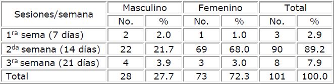 El tratamiento se realizó a través de sesiones por semanas, culminando la segunda semana con 90 pacientes y un 89.2 %; el sexo femenino reportó el mayor número de pacientes tratados, 73 para un 72.3 %. (Tabla 1).