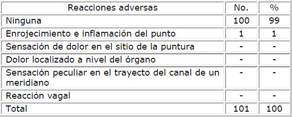 La Tabla 2 exhibe las reacciones que pudieran aparecer; el 99 % de los pacientes (100) no presentó reacciones adversas.