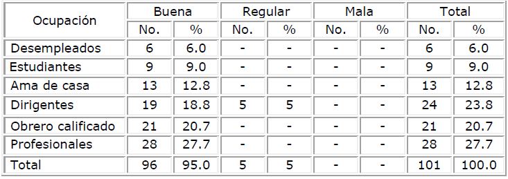 La evolución de los pacientes (Tabla 4) terminó con categoría de buena para 96 pacientes (95 %); demostrando mejoría notable, dentro del total de pacientes que acudió a la terapéutica se encontraban profesionales, dirigentes y obreros calificados, 28, 24 y 21 %, respectivamente.
