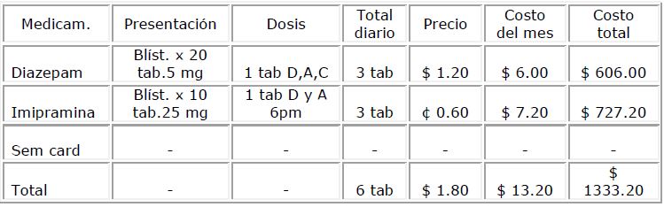Los pacientes con el tratamiento convencional (Tabla 5) representaron un gasto económico mensual de $13.20; todos los pacientes gastaron por cada medicamento $450.00 y $540.00 de diazepan e imipramina respectivamente, al utilizar la medicina tradicional, el ahorro fue considerable de $1333.20.
