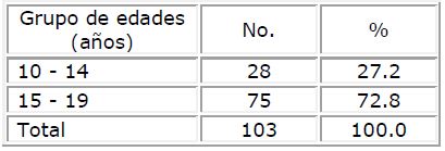 El grupo de edad que predominó fue el de 15-19 años, con 75 casos, para el 72.8 % de las adolescentes con aborto inducido. (Tabla 1)