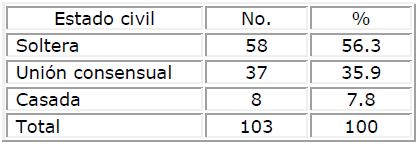 Según estado civil las solteras fueron las más afectadas (58) (56.3 %) (Tabla 2).