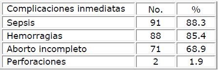 El universo de estudio estuvo constituido por las 103 adolescentes, a las cuales se les realizó el diagnóstico de la patología antes mencionada. Previo consentimiento informado, se revisaron los procesos de internamientos, y se confeccionó una encuesta por las autoras, para añadir otros aspectos de interés investigativo. Así se obtuvo el dato primario y se investigaron las variables edad, estado civil y las complicaciones más frecuentes, como: sepsis, hemorragias, aborto incompleto y perforaciones.