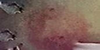 Piel: a nivel de la cara lateral interna del muslo derecho lesión en parche azulado y hundido con bordes irregulares y un centro pardo con enrojecimiento alrededor del perímetro con una ampolla central