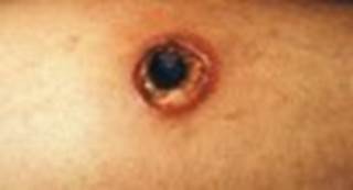 Loxoscelismo cutáneo: La evolución es a una úlcera necrótica o edematosa, que se define en las primeras 24 horas del cuadro y tiene una escasa repercusión sistémica, con fiebre y compromiso del estado general. Al fijarse en la úlcera, el signo evolutivo de lesión de color rojo-blanco-azul es típica del loxoscelismo.5