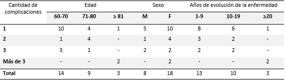 La Tabla 1 muestra que con respecto al número de complicaciones existentes en un mismo paciente se observó que 15 individuos contaban con una sola complicación, de ellos 10 con edad comprendida entre 60-70 años, que fue el grupo etario más numeroso con 14 pacientes. El sexo predominante fue el femenino con 18 individuos, en cuanto al rango de años de evolución de la diabetes mellitus que prevaleció fue el comprendido entre 1 y 9 años con un total con 13 pacientes.