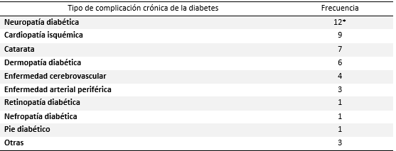 La complicación crónica de la diabetes mellitus más frecuente fue la neuropatía con 12 pacientes como se muestra en la Tabla 2.