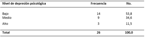 La Tabla 3 refleja que un total de 12 pacientes presentó niveles de depresión psicológica entre medio y alto para un 46,1%.