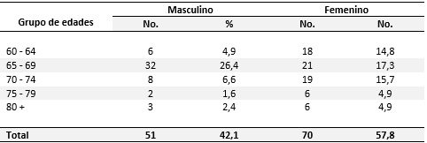 La Tabla 1 muestra que en el estudio predominó el grupo etario de 65-69 años, sexo masculino con un 26,4 %.