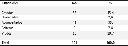 Hubo predominio de los pacientes casados con un número de 55 para un 45,4 %, siguiéndole en orden de frecuencia los acompañados con un 33,8 %, como se muestra en la Tabla 2.