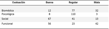 Según los resultados prevalecieron los daños en la esfera biomédica y funcional (Tabla 3), con 32 y 42 casos, respectivamente. Estas esferas se repitieron en más de un adulto mayor e incluso muchos de ellos tienen dañada todas las esferas.