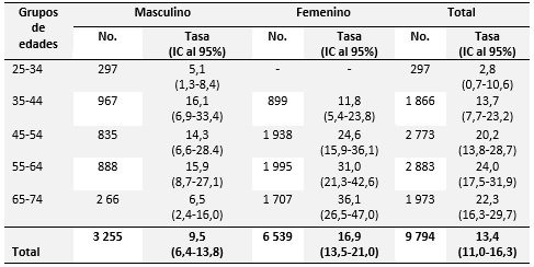 En el sexo femenino la prevalencia fue más elevada en el grupo de edades de 65-74 años (36,1 %, IC: 26,5-47,0).