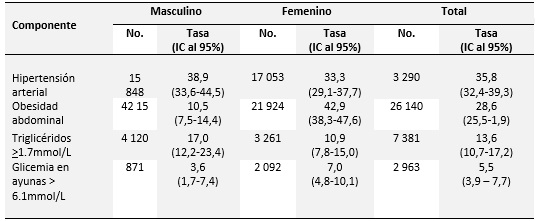 La glicemia en ayunas > 6,1 mmol/L estuvo presente en el 5,5 % (IC: 1,7-7,4) y la obesidad abdominal en el 28,6 % (IC: 25,5-31,9), predominando estos dos componentes en el sexo femenino. (Tabla 2).