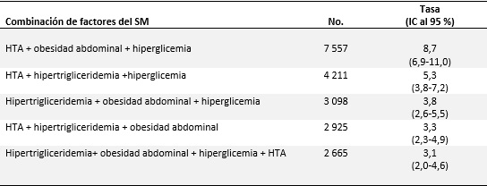 Cuando existió confluencia de tres factores del SM (Tabla 3) la mayor prevalencia existió en la combinación de HTA, obesidad abdominal y glucosa en ayunas mayor o igual a 6.1 mmol/l, el 8.7 % de los individuos de la población presentaron estos componentes (IC: 6,9-11,0).