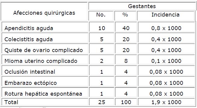 El abdomen agudo en el embarazo se presentó con una incidencia de 1,9 por cada 1 000 gestantes.