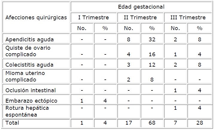 Method: a retrospective cross-sectional descriptive study of 25 clinical histories of pregnant patients who presented an acute surgical abdomen in the period from November 1996 to November 2005.
