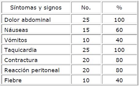 Existen una serie de signos y síntomas que cuando están presentes podemos hacer el diagnóstico clínico en más de un 90 % de los casos, estos son: dolor abdominal agudo, náuseas y/o vómitos, contractura, reacción peritoneal y taquicardia; varios autores coinciden en este aspecto1,4,9, lo que nos permitió hacer el diagnóstico clínico en el 100 % de los casos y llegar al diagnóstico etiológico en el 80 %. Sólo en 4 casos no se realizó en el preoperatorio: 3 pacientes con quistes de ovario complicados y 1 paciente con un vólvulo de ciego, inicialmente diagnosticados como una apendicitis aguda.