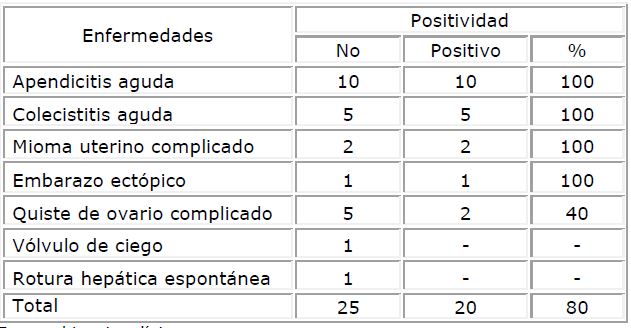 El 80 % de los casos fue diagnosticado positivo de manera general. Fue del 100 % en el diagnóstico clínico de la apendicitis aguda, colecistitis aguda, mioma uterino complicado y embarazo ectópico, no así para el quiste de ovario que fue del 40 %, y para la oclusión intestinal y rotura hepática espontánea que fue del 0 % (Tabla 5).