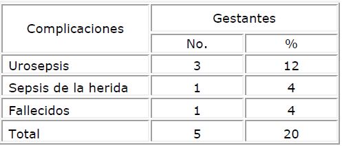 Predominaron las complicaciones sépticas: urosepsis (12 %) y sepsis de la herida quirúrgica (4 %), para un índice de morbilidad del 20 %, con un índice de mortalidad materna del 4 % (Tabla 6).