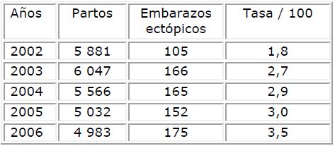 La ocurrencia del embarazo ectópico ha ido aumentando discretamente. La mayor frecuencia fue en el 2006, con una tasa de 3,5 (Tabla 1).