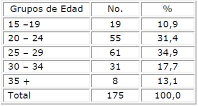 La mayor frecuencia de los embarazos ectópicos se presenta fundamentalmente en las edades fértiles de la mujer entre los 20-29 años. Dicho grupo en este estudio constituye el 66,3 % (116 mujeres) (Tabla 2). El grupo de edades de 25-29 años fue el de mayor frecuencia con el 34,9 %, seguido por el de 20-24 con el 31,4 %, con 61 y 55 pacientes, respectivamente.