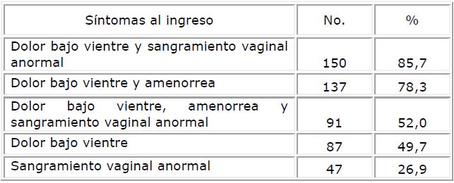 El 85,7 % de las pacientes acudió con los síntomas de dolor bajo vientre y sangramiento vaginal anormal, seguidas por las que presentaron dolor bajo vientre y amenorrea (78,3 %) (Tabla 3).