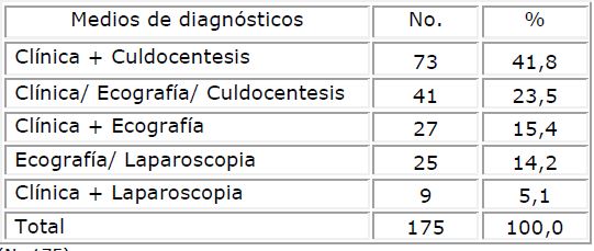 El diagnóstico más frecuente en este estudio fue la clínica más culdocentesis en el 41,8 % de los casos (Tabla 4), seguido por la clínica ecografía/ culdocentesis en el 23,5 %, 41 pacientes.