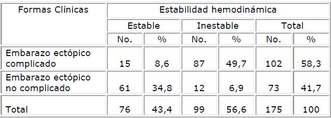 Según formas clínicas y estabilidad hemodinámica al ingreso (Tabla 5), se encontró que más de la mitad de los embarazos ectópicos se complicaron (58,3 %), 102 pacientes. Hubo predominio de los embarazos complicados inestables (49,7 %), seguidos por los embarazos ectópico no complicados estables con el 34,8 %, (61 casos).