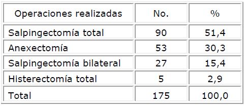 La operación más realizada en este período de estudio resultó ser la salpingectomía total (51,4 %), seguida en orden de frecuencia por la anexectomía (30,3 %) (Tabla 6).