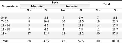 La distribución de pacientes con estrabismo según grupos etarios y sexo se muestra en la Tabla 1. Predominaron los mayores de 18 años con un 37.5 y el 52.5 % perteneció al sexo femenino.