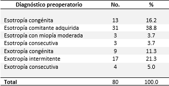 En la Tabla 2 se refleja la distribución de los pacientes según diagnóstico preoperatorio, en la que predominó la esotropía comitante adquirida (38.8 %) en relación a las esodesviaciones, y la exotropía intermitente en el caso de las exodesviaciones (21.3 %).