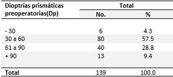 Al relacionar la distribución de los pacientes estudiados según dioptrías prismáticas preoperatorias (Tabla 3), el 57.5 % de los casos presentaron entre 30 y 60 dioptrías prismáticas, seguido por los del rango de 61 a 90 Dp para un 28.8 %.