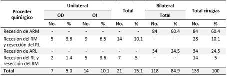 En la Tabla 4 se observa un predominio de la cirugía bilateral (84.9 %), siendo el proceder quirúrgico más frecuente la recesión de ambos rectos medios (ARM) (60.4 %) en el caso de las cirugías bilaterales y con respecto a las monoculares lo fue la recesión del recto medio (RM) y resección del recto lateral (RL) (10.1 %), constituyendo el ojo izquierdo el más intervenido.