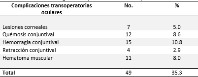 En la Tabla 5, se muestran las complicaciones transoperatorias oculares. El 35.3 % de los ojos intervenidos presentó complicaciones transoperatorias y el mayor porcentaje (10.8 %) estuvo representado por la hemorragia conjuntival.