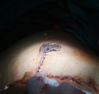 Siembra del complejo areola pezón como injerto y sutura de este en el área despitelizada, el cual es asegurado con apósito atado (Figuras 3 y 4).